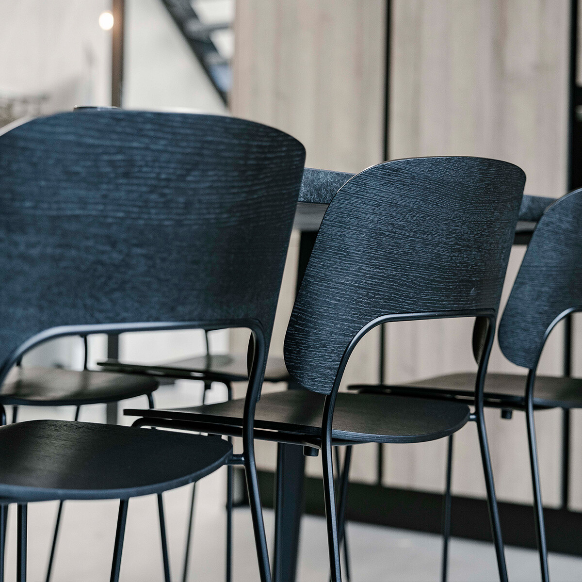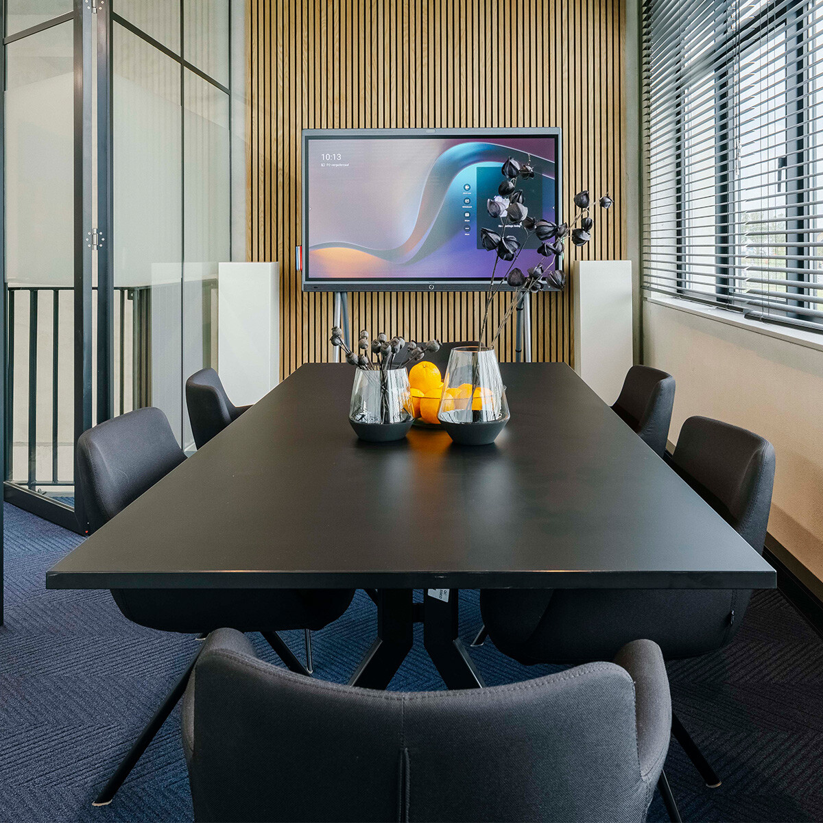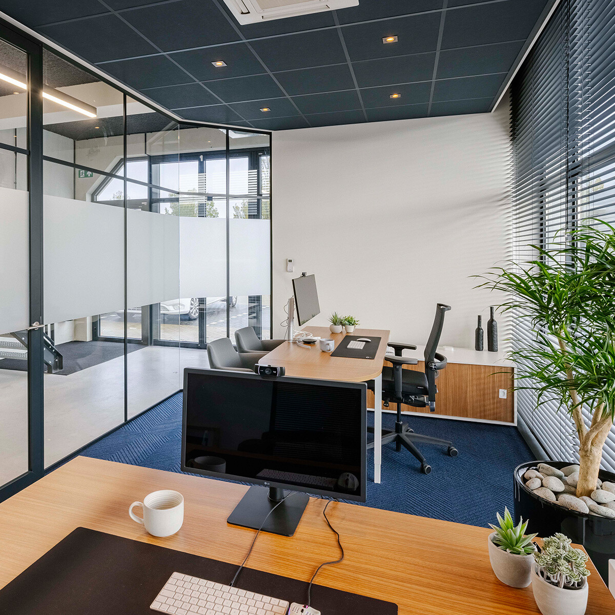De wensen waren duidelijk, maar de uitdaging zat in de vergaderruimte en het directiekantoor. Twee bureaus tegenover elkaar of naast elkaar was niet gewenst. Daarom heeft Ricky gekozen voor twee hoekbureaus. Doordat de bureaus ook over bergruimte beschikken zijn er geen kasten meer nodig. Hierdoor is er ruimte ontstaan voor bezoekersstoelen. De vergaderruimte was eveneens smal en lang. Ricky selecteerde comfortabele vergaderstoelen en een zwarte vergadertafel met luxe uitstraling. Ricky: "Hoewel er gekozen is voor donkere meubels oogt de ruimte toch licht en ruim. Het voelt zelfs ruimer dan toen de kamer nog leeg was. Het is zo mooi dat de juiste keuzes voor dit effect kunnen zorgen."