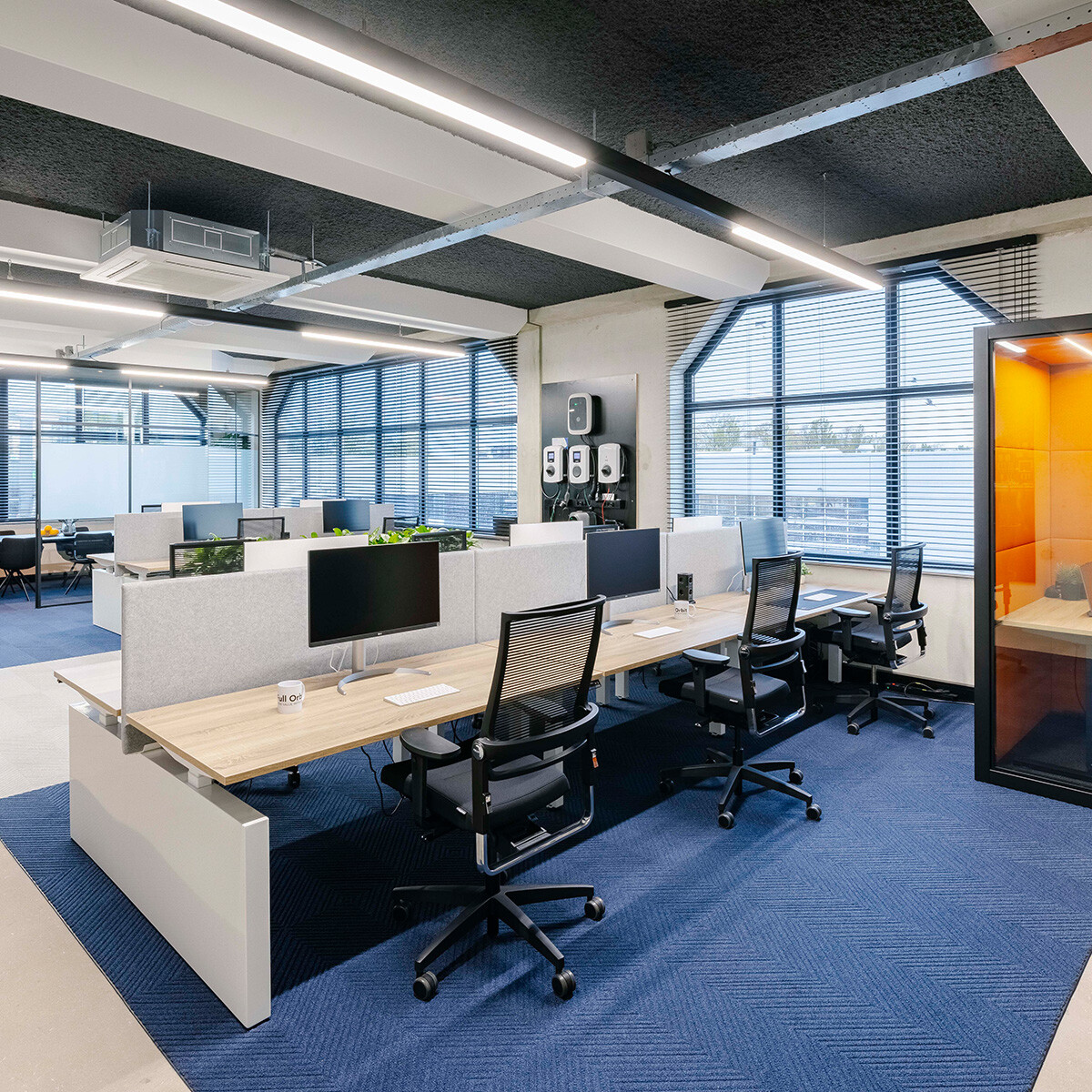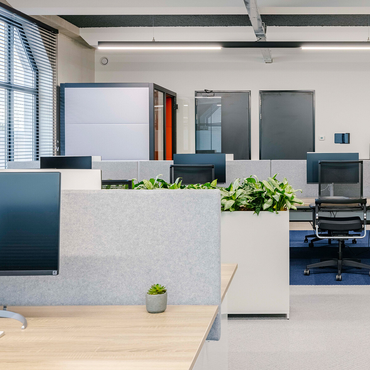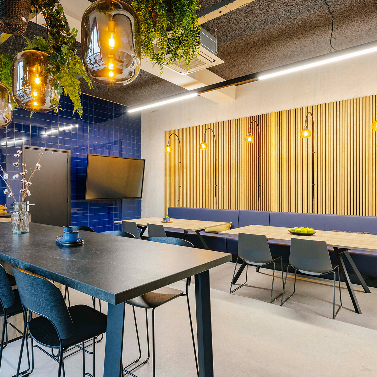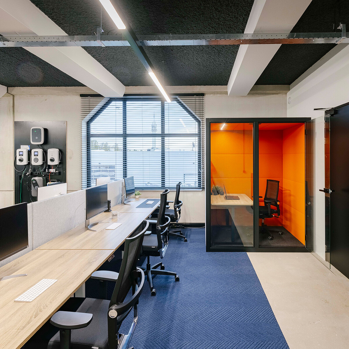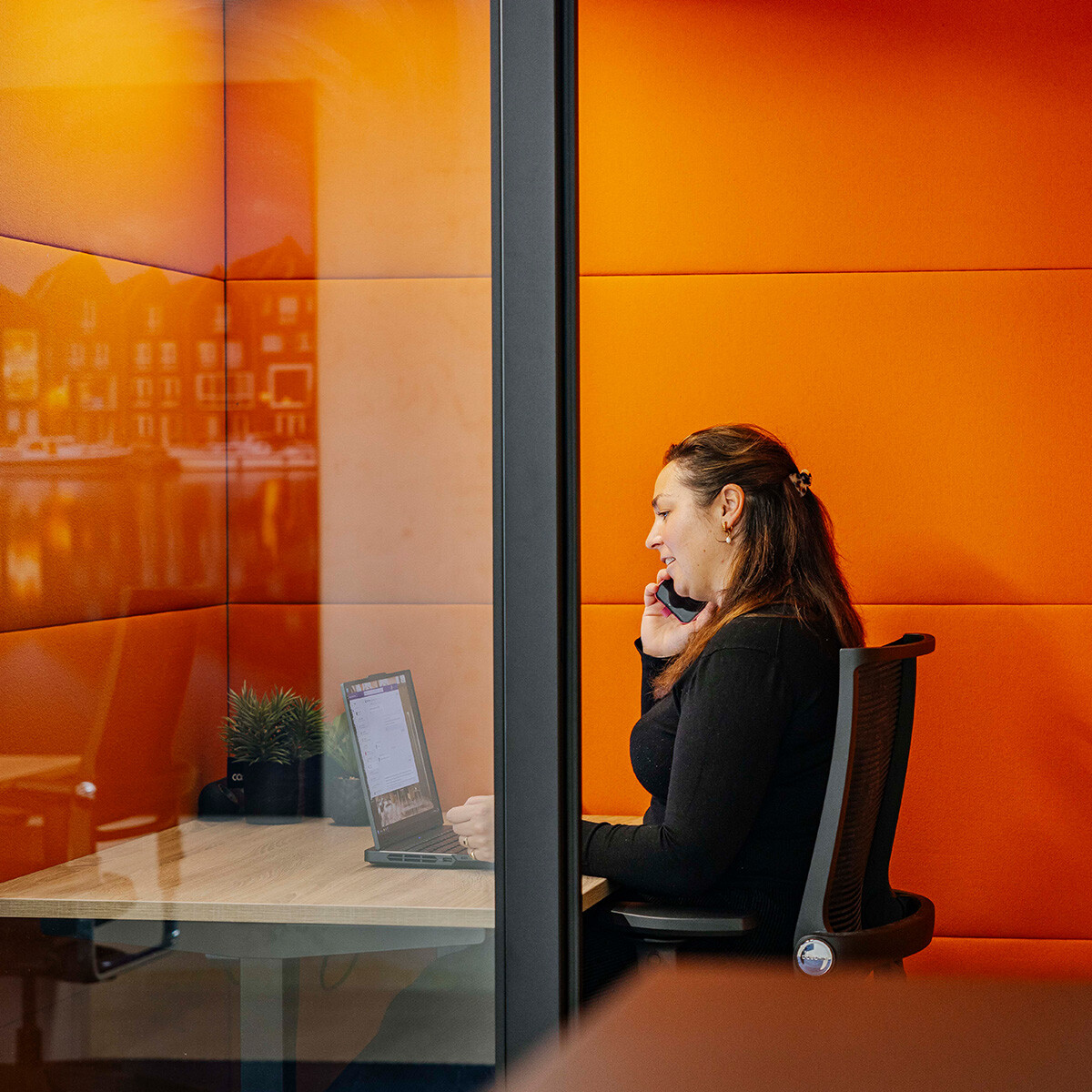 'Het sociale hart', zo wordt de kantine van Full Orbit genoemd. Het moest een plek worden waar mensen graag samen komen, waar wordt geluncht en waar successen worden gevierd. We kozen voor een combinatie van comfortabele, maar makkelijk te onderhouden banken en stoelen en gezellige barkrukken voor aan de bar. Voor meer sfeer hingen we glazen lampen en niet van echt te onderscheiden kunstplanten op. Ricky: "Ik ben supertrots dat deze puzzel is gelukt en dat de klant tevreden is. Zeer tevreden zelfs, want na een paar maanden kregen we de volgende aanvraag binnen: een akoestische belcel. Gelukkig hadden we bij de werkplekken nog ruimte over gehouden. Het is zo fijn om vanaf het begin mee te mogen denken met de klant. Een project als deze geeft mij veel voldoening. Het was een geweldige opdracht."